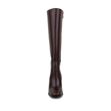 Bota alta vestir, de piel en color café con cierre interno, punta cuadrada y costura lateral.