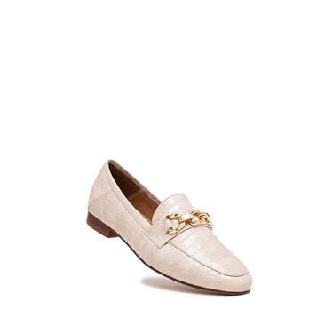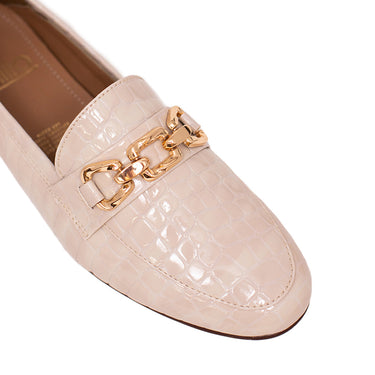 Mocasín con textura de cocodrilo en color negro y herraje estilo cadena en color oro.