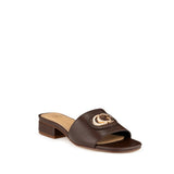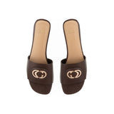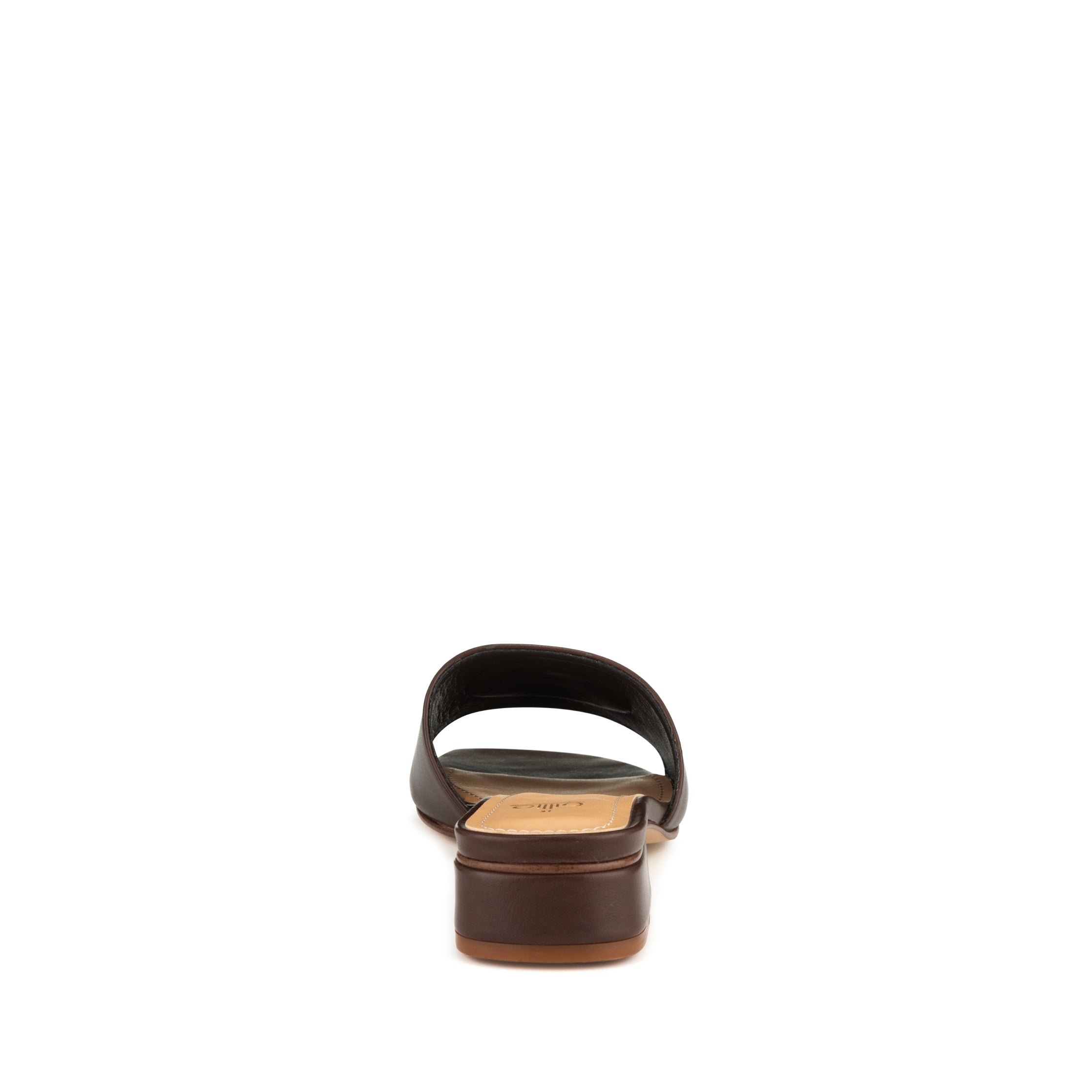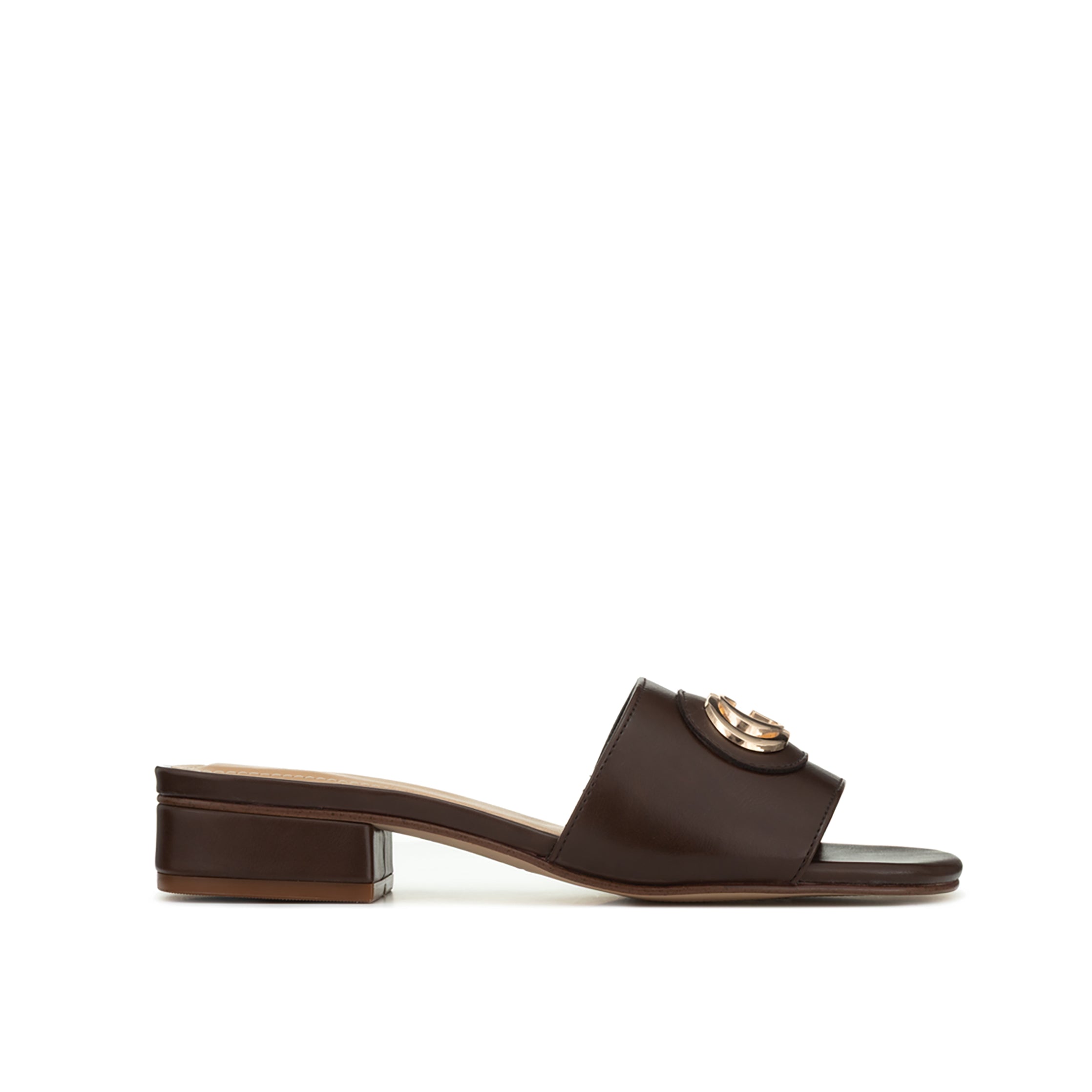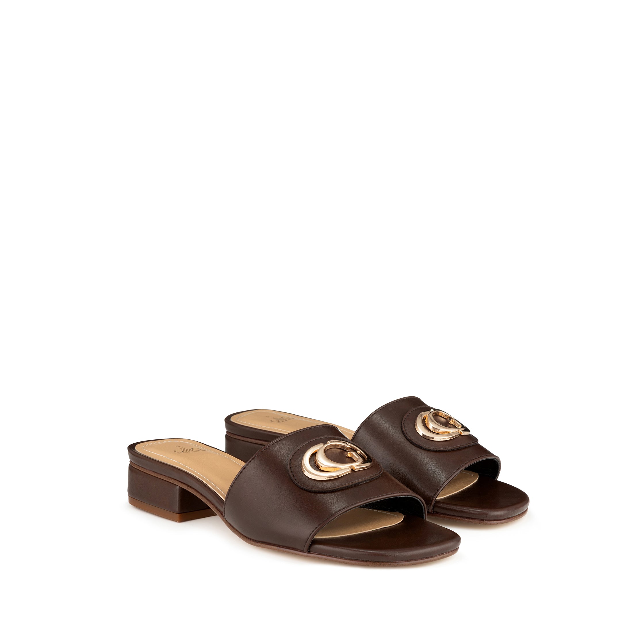 SANDALIA TACÓN BAJO EN CAFÉ NEGRO CON HERREJE DORADO EN CHINELA